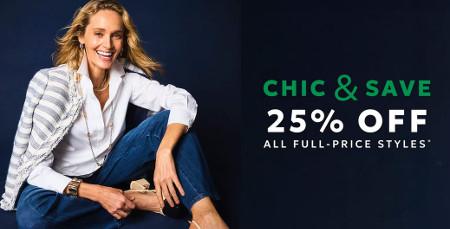 25% Off All Full-Price Styles. Offer valid for a limited time. Offer valid in U.S. Chico's Stores (excluding Chico's Outlets and Chico's Off The Rack stores) at chicos.com and by phone 888.855.4986. Prices as marked.